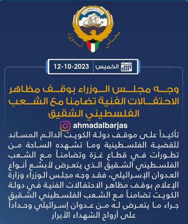 وجاء في بيان رسمي صادر عن مجلس الوزراء في الكويت:”وجه مجلس الوزراء الكويتي اليوم الخميس بوقف مظاهر الاحتفالات الفنية في البلاد، تضامناً مع الشعب الفلسطيني الشقيق جراء ما يتعرض له من عدوان إسرائيلي، وحداداً على أرواح الشهداء الأبرار”.