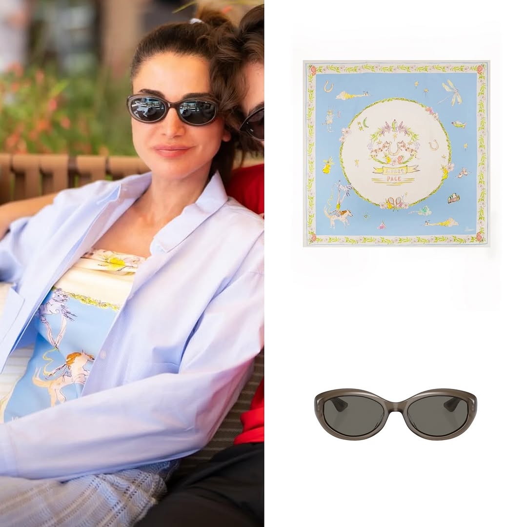 لمناسبة عيد الفطر، أضافت الملكة رانيا لمسة رقيقة واحتفالية إلى إطلالتها. فقد اعتمدت وشاحاً حريريّاً من (Alemais)، أضفى لمسة أنيقة، عصرية وراقية. وقد نسّقته مع نظارة شمسية من (Oliver Peoples)، بالتعاون مع (Khaite NY)، بتصميم (Taupe) وعدسات باللون الرمادي الكربوني، مما منحها إطلالة متوازنة وعصرية.