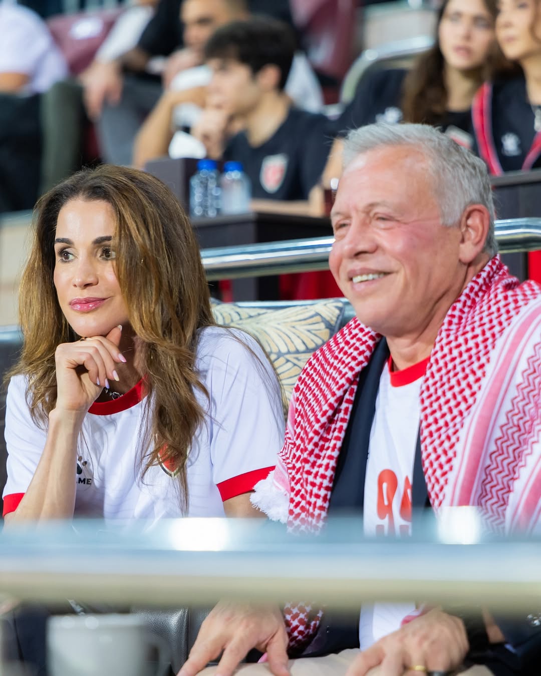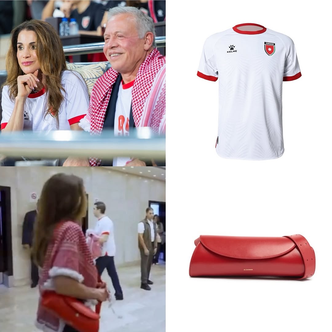 دعمت الملكة رانيا المنتخب الأردني بإطلالة رياضية أنيقة خلال حضورها مباراة الأردن والعراق في تصفيات كأس العالم. لهذه المناسبة، ارتدت القميص الرسمي للمنتخب الوطني من (Kelme Jordan)، وأضافت لمسة مترفة عبر حقيبة جلدية باللون الأحمر من (Jill Sander) بتصميم (Cannolo). جمعت هذه الإطلالة ما بين الروح الوطنية والذوق الملكي الرفيع في آن.