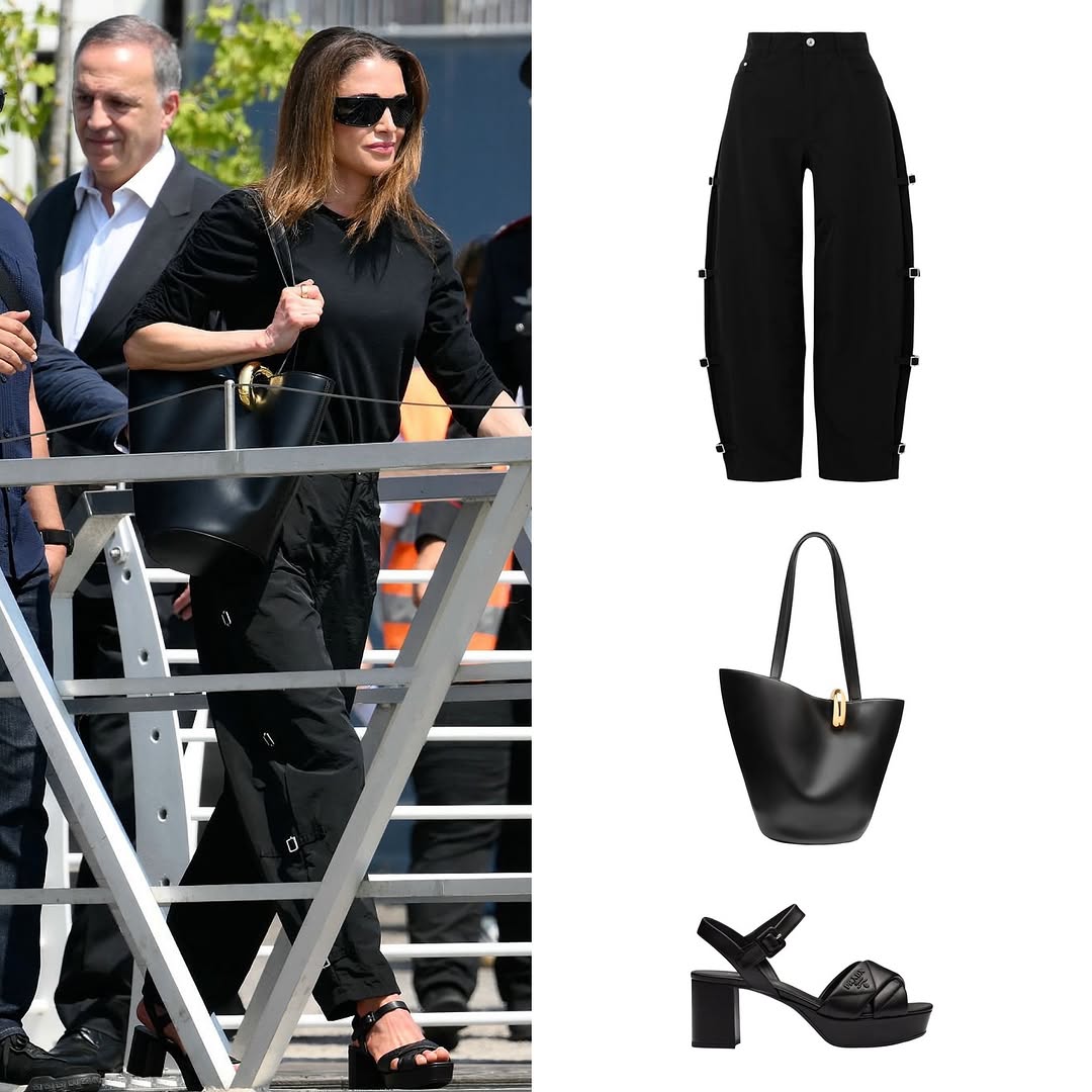 وصلت الملكة رانيا إلى البندقية بستايل عصري مونوكرومي باللون الأسود. ارتدت “توب” (Waldorf) من (Veronica Beard) باللون الأسود، ونسّقته مع سروال (Chamomile) من (Wandler) بقصّة ضيقة أنيقة. وأكملت إطلالتها بأكسسوارات متقنة من حقيبة (The Medium Bambola) من علامة “جاكيموس” (Jacquemus) باللون الأسود، وصندل جلدي مبطّن بكعب عالٍ من “برادا” (Prada)، ونظارة شمسية (SL 806) من “إيف سان لوران” (YSL). ويكمن القول، من خلال هذه الإطلالة الجديدة بالكامل للملكة رانيا، إنّها عكست ذوقها العصريّ في إطلالات السفر.