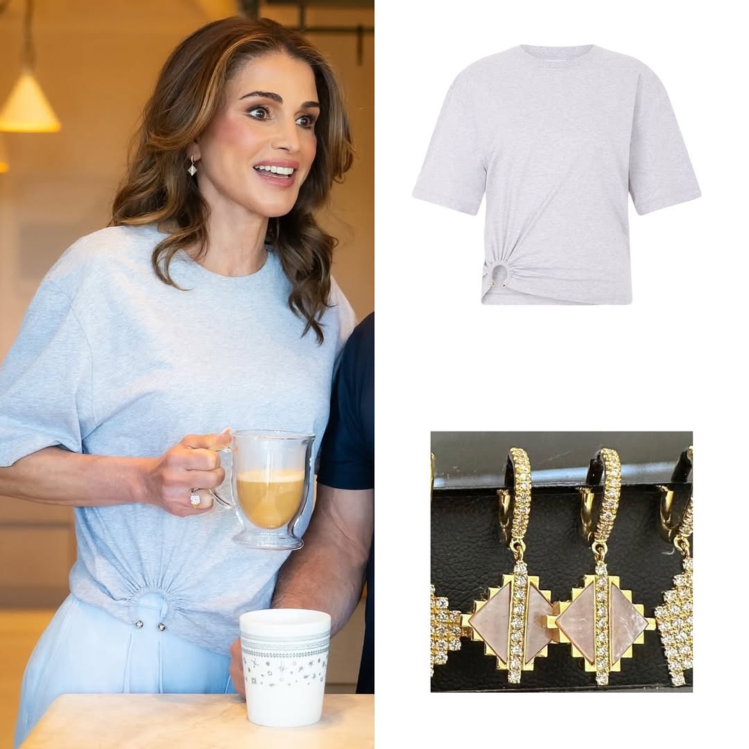 اعتمدت الملكة رانيا إطلالة بسيطة وعصرية خلال استراحة قهوة برفقة الملك عبدالله، فارتدت تي شيرت باللون الرمادي من علامة “رابان” (Rabanne)، وهو من القطع الجديدة في خزانتها. وأكملت إطلالتها بأقراط سبق أن تألّقت بها من تصميم نجلاء بنت عاصم، لتضفي لمسة أنيقة على هذا اللوك غير المتكلّف.