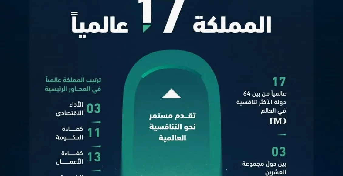 حققت المملكة المرتبة (17) عالميًا من أصل (64) دولة هي الأكثر تنافسية في العالم، لتصبح من الدول الـ(20) الأولى لأول مرة في تقرير الكتاب السنوي للتنافسية العالمية، الصادر عن مركز التنافسية العالمي التابع للمعهد الدولي للتنمية الإدارية (IMD)، والذي يعد واحدًا من تقارير التنافسية الرئيسة التي يتابعها ويحللها المركز الوطني للتنافسية بالتنسيق مع الجهات الحكومية ذات العلاقة.