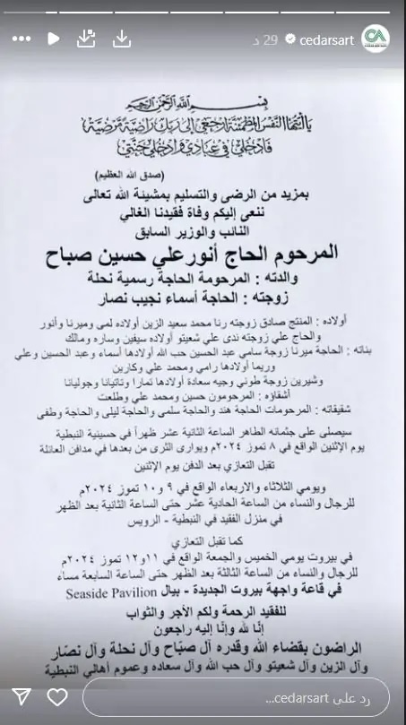 غيب الموت والد المنتج صادق الصباح، الوزير والنائب اللبناني السابق أنور علي الصباح، عن عمر ناهز الـ 91 عاماً، ويوارى الثرى اليوم الاثنين بمدافن العائلة في مدينة النبطية عند الساعة الحادية عشرة صباحاً.