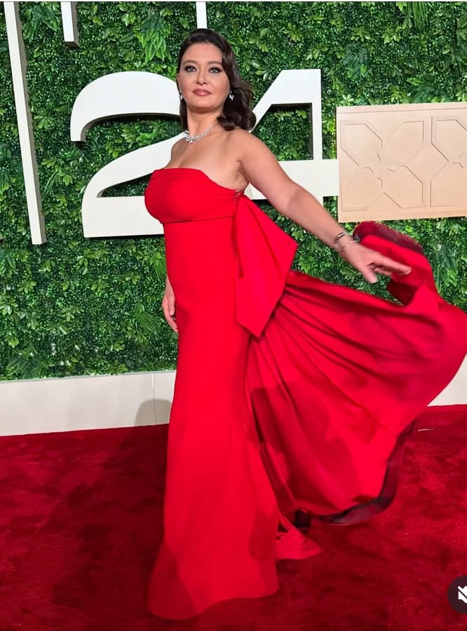 وفي طلة أخرة اعتمدت اللون الأحمر لاسيما خلال الافتتاح على السجادة الحمراء حيث سطع لون الجمر القاني بحرارته ولونه الفاقع. ثوب يأتي على طول الجسم ويضمه ثم يتفرد منه ذيل طويل من الخلف على شكل كشاكش وعقدة كبيرة. وفي هذه الافتتاحية اعتمدت تسريحة الشعر المردود إلى الخلف مع تموجات عريضة وغرة عالية فوق الجبين لتظهر المجوهرات الماسية لماعة على الصدر. أما المكياج فجاء قوياً محدداً للعين وأحمر شفاه من فئة الزهري اللماع .
