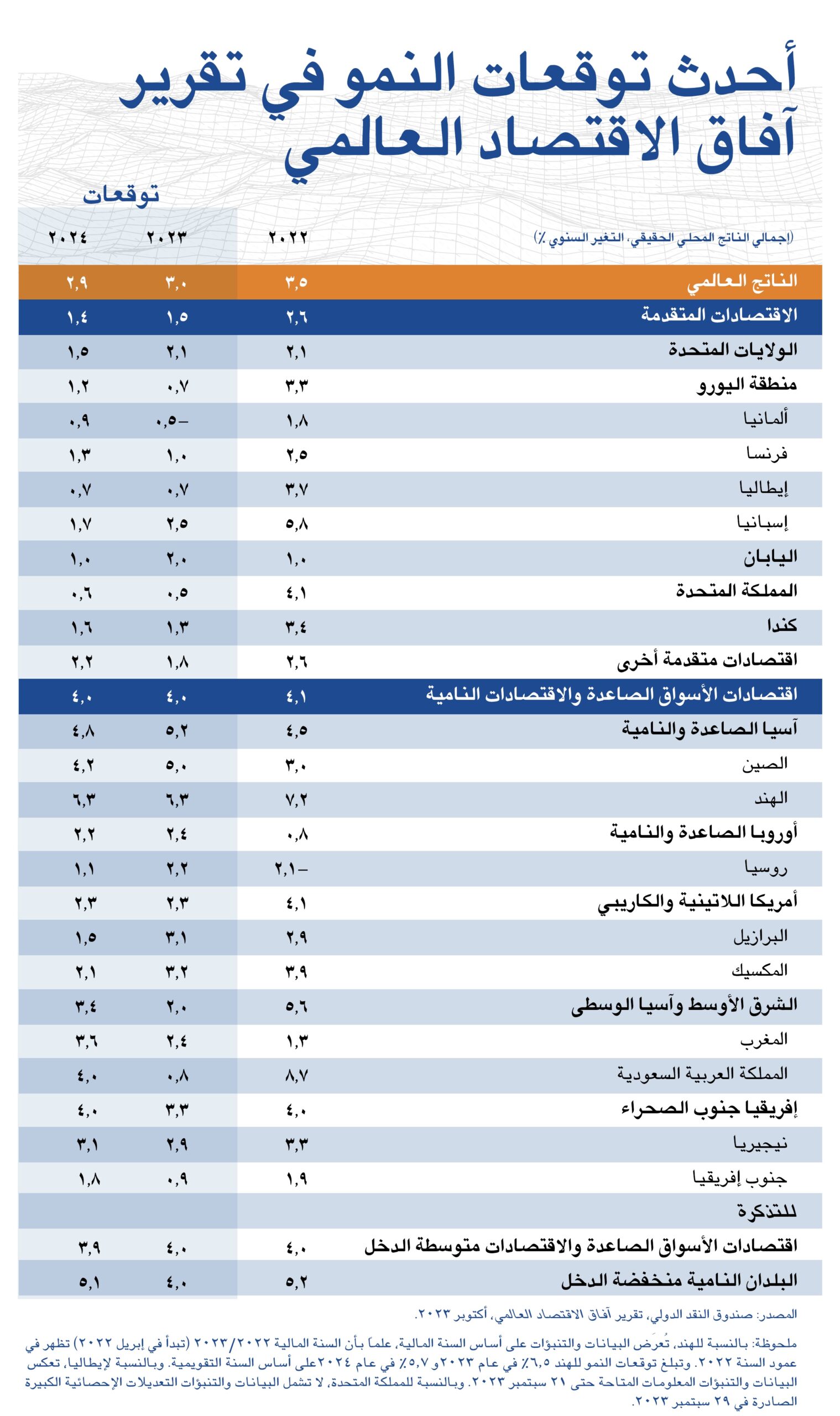 التقرير الذي حصلت “نص خبر” على نسخةٍ منه، توقع تسجل اقتصادات الأسواق الصاعدة والاقتصادات النامية انخفاضا محدوداً في معدلات النمو من 4,1 ٪ في عام 2022 إلى 4,0 ٪ في عامي 2023 و 2024 نتيجة استفحال أزمة القطاع العقاري في الصين. فيما ستشهد اقتصادات الشرق الأوسط وآسيا الوسطي نمواً بنسبة 2 ٪ في 2023، على أن يرتفع إلى 3.4 ٪ في العام 2024، حيث توقع التقرير نمواً في اقتصاد المملكة العربية السعودية بنسبة 4 ٪ في 2024، على أن يُسجل 0.8 ٪ خلال العام الجاري 2023. في حين أشارت بيانات التقرير تسجيل الاقتصاد المغربي نمواً ستبلغ نسبته 2،4 ٪ في العام 2023، على أن ترتفع هذه النسبة إلى 3,6 ٪ في 2024.
