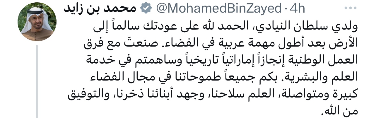 وأعرب صاحب السمو الشيخ محمد بن زايد آل نهيان رئيس دولة الإمارات العربية المتحدة، عن امتنانه لعودة رائد الفضاء الإماراتيسلطان النياديسالماً إلى الأرض بعد أطول مهمة عربية في الفضاء. وأكد صاحب السمو الشيخ محمد بن زايد آل نهيان من خلال تغريدة نشرها سموه عبر حسابه الرسمي فيإكس، أنالنياديوفرق العمل الوطنية حققت إنجازاً إماراتياً تاريخياً وساهمت في خدمة البشرية.