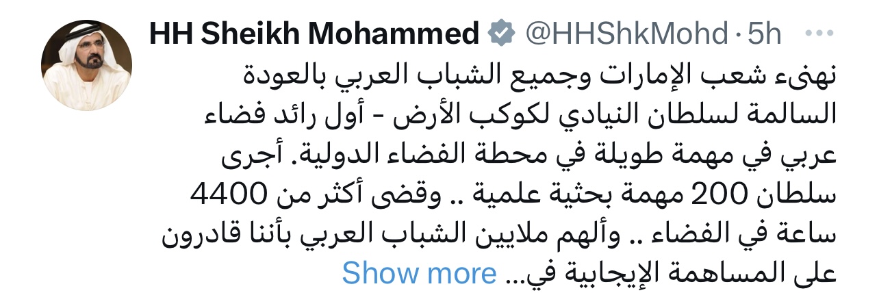 وفي نفس السياق، هنأ صاحب السمو الشيخ محمد بن راشد آل مكتوم نائب رئيس دولة الإمارات العربية المتحدة رئيس مجلس الوزراء حاكم دبي، من خلال حسابه الرسمي فيإكس، شعب الإمارات وجميع الشباب العربي بالعودة السالمة لسلطان النيادي لكوكب الأرض، ليكون بذلك أول رائد فضاء عربي في مهمة طويلة في “محطة الفضاء الدولية“.