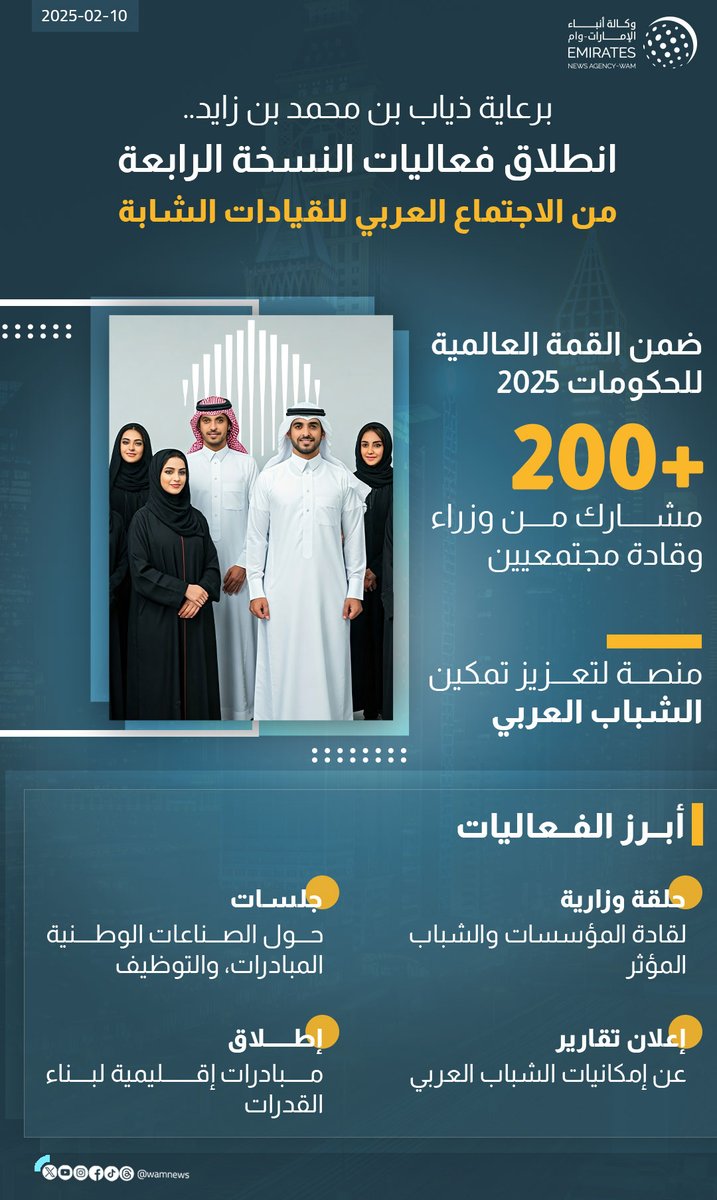 برعاية ذياب بن محمد بن زايد، انطلقت النسخة الرابعة من الاجتماع العربي للقيادات الشابة ضمن أعمال اليوم التمهيدي للقمة العالمية للحكومات.