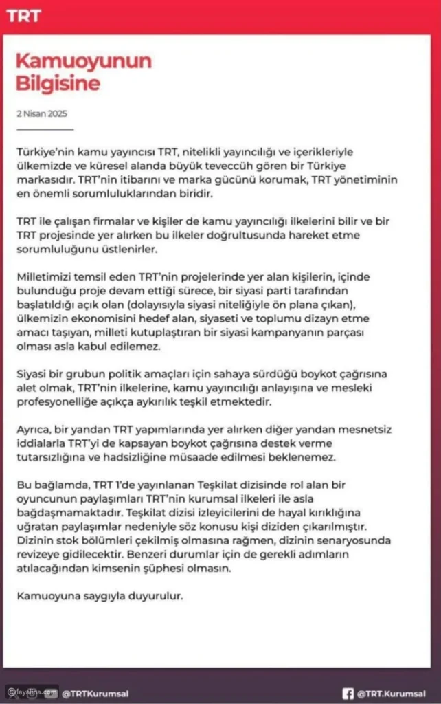 و تم استدعاء الممثلة من طرف النائب العام، و بذلك نشرت قناة trt1 الحكومية بيان و اعلنت طرد الممثلة و الحلقات التي تم تصويرها و هي موجودة سيتم حذفها و انهاء دورها دون الحاق الضرر بالمسلسل.