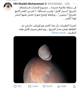 وشارك الشيخ محمد بن راشد آل مكتوم، نائب رئيس دولة الإمارات العربية المتحدة، حاكم دبي، صورة قمر المريخ ديموس عبر حسابه في تويتر، وغرد قائلا: في سابقة عالمية جديدة … مشروع الإمارات لاستكشاف المريخ “مسبار الأمل” يقترب لمسافة ١٠٠ كم من القمر التابع للمريخ “ديموس” .. ويلتقط أوضح صورة حصل عليها البشر لهذا القمر … تخبرنا النظريات بأن هذا القمر هو كويكب خارجي تم التقاطه ضمن مدار المريخ .. ويدحض مسبار الأمل هذه النظرية ليثبت عبر أجهزته وفريق عمله بأن هذا القمر في الأغلب كان جزء من كوكب المريخ وقد انفصل عنه قبل ملايين السنين .. تماماً مثل قمر الأرض .. الذي كان جزءاً منها وانفصل عنها .. فخورين بعلمائنا الشباب .. فخورين بعلومنا .. فخورين بمساهمتنا في مسيرة المعرفة البشرية“.