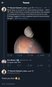 هنأ إيلون ماسك دولة الإمارات العربية المتحدة على الصور المذهلة والمدهشة التي التقطها “مسبار الأمل” لقمر المريخ “ديموس”. وجاءت تهنئة الملياردير الأمريكي كردٍ على تغريدة مؤثر السوشيال ميديا الإماراتي “حسن سجواني” عبر حسابه في تويتر.