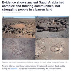 توصلت دراسة قامت بها مجلة Levant العلمية إلى أن المملكة العربية السعودية كانت بها مجتمعات تعيش حياة اجتماعية وزراعية متنوعة ومزدهرة قبل قرابة 8000 عام، ولم يكونوا مجرد مجموعات تكافح للعيش في أرض قاحلة كما يُعتقد سابقاً.