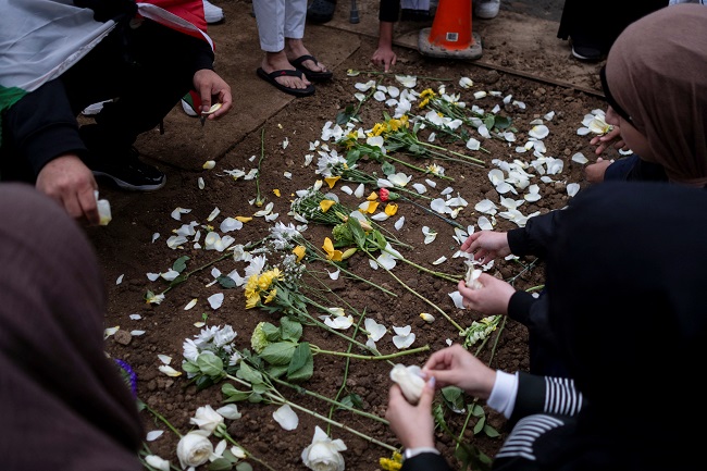 وتدلت الأعلام الفلسطينية من نوافذ السيارات في موكب باتجاه المسجد، فيما كتب على لوحة إعلانية رقمية “أوقفوا التحريض على العنف والكراهية ضد المجتمعات الفلسطينية والعربية والمسلمة”.