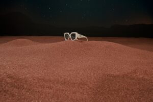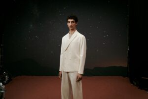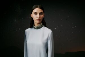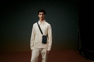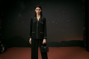 يعكس تصميم التشكيلة الحصرية من الأزياء والأكسسوارات للنساء نفس الأجواء التي تعكسها الصور الفوتوغرافية، بألوان تتدرج من الأزرق السماوي إلى الكحلي الداكن والأسود. تتألق قطع الكريستال المطرّزة بحرفية رائعة على بلوزات من الحرير وعباءات مصنوعة من أقمشة خفيفة وحقائب أنيقة، تبرز منها حقيبة Prada Galleria صغيرة الحجم، وصنادل من الجلد. بينما تتألق تشكيلة الرجال بلوحة ألوان أفتح: ألوان ترابية دافئة تكاد تلمح إلى وتستبق شعاع الفجر الذي يتبع الليل لا محالة.