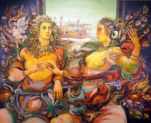 ولأنه ليس ثمَّة جنَّة بلا أنثى.. أو حيث تكون الأنثى تكون الجنَّة، فالمرأة سيدة الجنَّة وليست حوريتها، “ملكة في كلِّ حالاتها” هكذا يقول دائماً، وبذات الطَّريقة تجسِّدها لوحاته بكلِّ ما فيها من نمنماتٍ وزينةٍ وزخارف، لا يمكن أن تكون المرأة امرأة بدونها – حسب مفهومه – . وعلى جسد المرأة ووشي زينتها تتمازج أزمنة الأرض السُّورية، من عصر سومر وأكاد حتَّى اليوم، ومن سيرة الوشم الأوَّل، حتَّى آخر صيحات الزِّينة المعاصرة.
