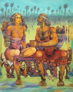 كأنَّه يرتحل مع شخوص أساطيره ويعيش قلقها، وكأنَّ ريشته تُعبِّر عمَّا تصبو إليّه أفكاره وتروم لأجله أنامله بالقول: “على هذه الأرض ما يستحقُّ الحياة”، ليس الآن فحسب، بل منذ آلاف السِّنين، استحقاق القدرة والبقاء للأفضل، أو هو الأقوى من عدَّة وجوه. لذلك ترفض ريشته وألوانه وسكِّينه على أرضيّة لوحاته الاستسلام لقدر الإنسان المحتوم بالموت والفناء، تماماً كما  لم يشأ جلجامش أن يستسلمَ لذات القدر، فسعى في رحلته الشَّهيرة باحثاً عن وصفة الخلود الأبديّة، متيقّناً في الظَّاهر أنّه سيبلغها، لكنَّ الوعي الخفيّ كان يسير عكس ذلك – حتَّى لو أنكره جلجامش – وأنكرناه نحن على مرِّ السِّنين.