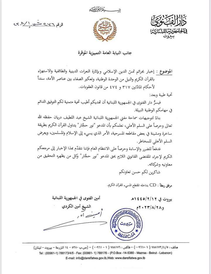 وكانت دورية للمباحث الجنائية قد أوقفت نور حجار على الرغم من أنه لم يتبلغ رسميًا بالدعوى المقدمة ضده من قبل دار الفتوى.