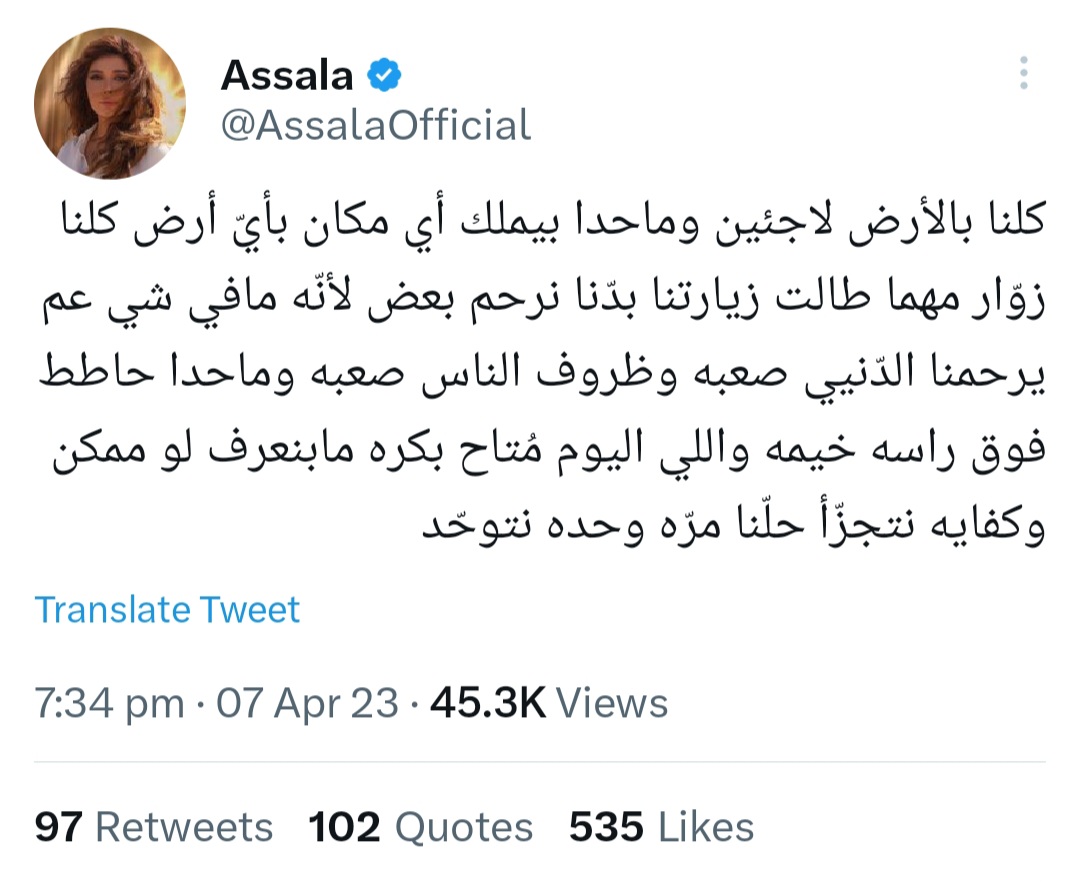 وقالت “كلنا بالأرض لاجئين وما حدا بيملك أي مكان بأيّ أرض كلنا زوّار مهما طالت زيارتنا”.