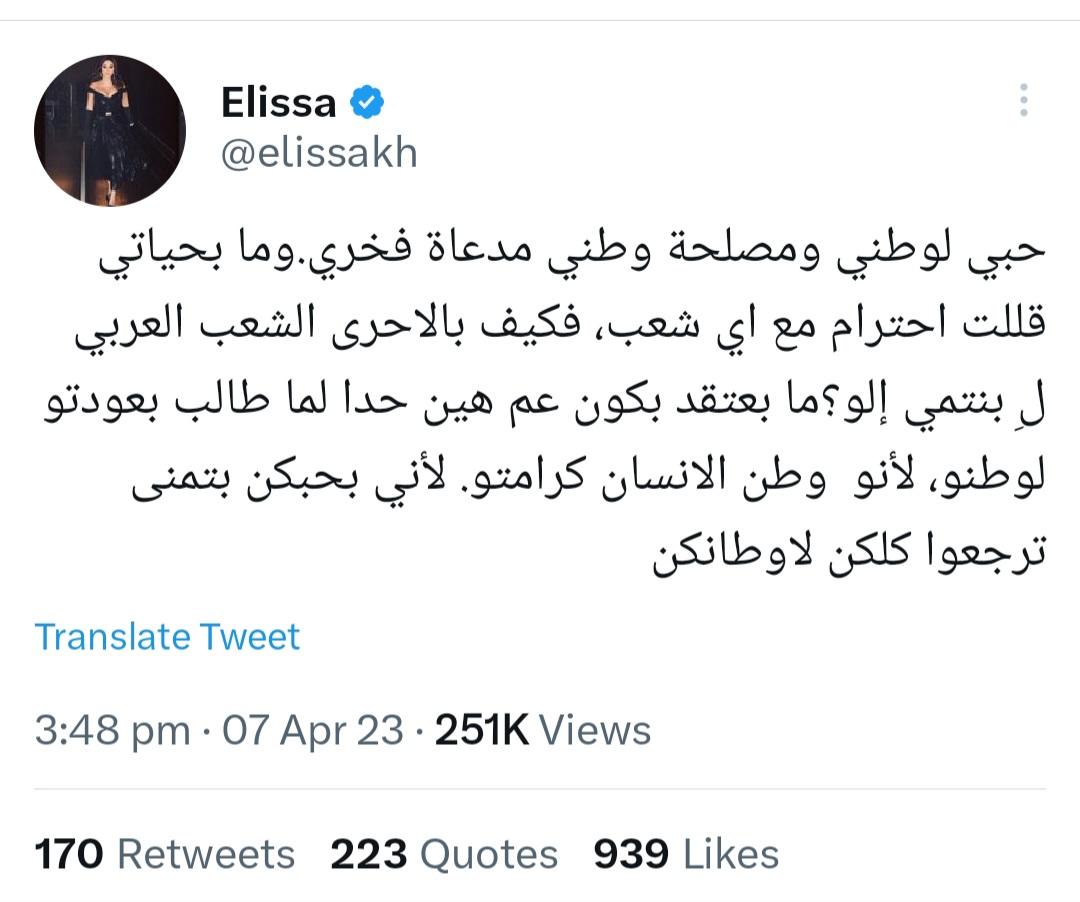 وكانت إليسا قد أعادت نشر تغريدات تدعو إلى طرد الفلسطينيين والسوريين من لبنان بعد إطلاق عناصر مسلحة قيل إنها فلسطينية صواريخ من لبنان تجاه إسرائيل يوم أمس الخميس، وبعد الهجوم عليها كتبت موضحة أنها لم تقصد إهانة أحد، وأن وطن الإنسان كرامته، وأنها انطلاقا من محبتها للعرب تتمنى أن يعود كل مواطن إلى وطنه.