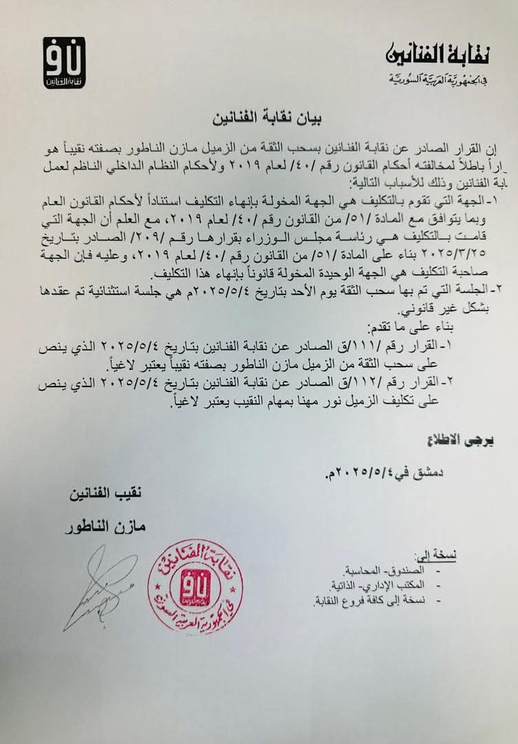 أصدرت نقابة الفنانين بياناً ممهوراً بتوقيع نقيب الفنانين مازن الناطور رداً على القرار الصادر بسحب الثقة عنه بصفته نقيباً.