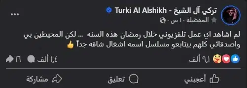 وكتب “تركي” عبر حسابه الرسمي بموقع التواصل الاجتماعي “فيسبوك”: “لم أشاهد أي عمل تلفزيوني خلال رمضان هذه السنة، لكن المحيطين بي وأصدقائي كلهم بيتابعو مسلسل اسمه أشغال شقه جداً”.