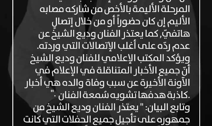 ونشر وديع بيانا، شكر من خلاله كل من واساه بمصابه واعتذر عن عدم تمكنه من الرد على الجميع.وجاء في البيان: “يشكر الفنان وديع الشيخ كل من واساه ووقف إلى جانبه في هذه المرحلة الأليمة بالأخص من شاركه مصابه الأليم إن كان حضورا أو من خلال اتصال هاتفي، كما يعتذر الفنان وديع الشيخ عن عدم رده على أغلب الاتصالات التي وردته”.