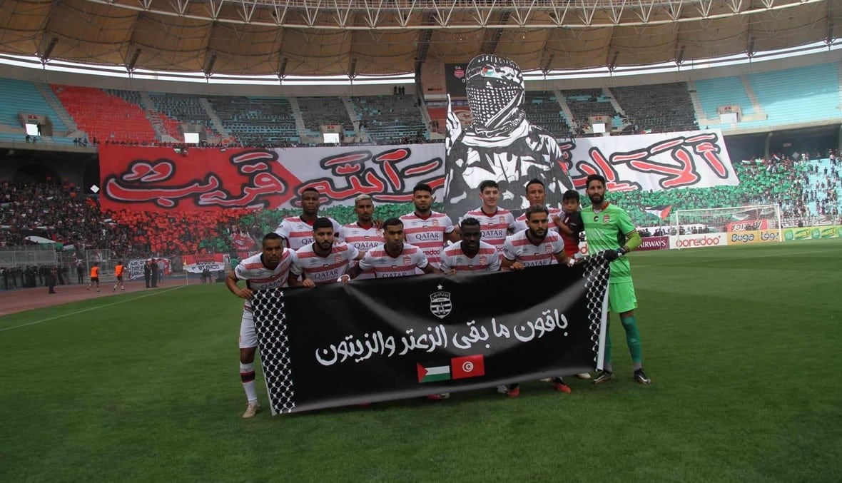 الى جانب الأناشيد ورفع الشعارات المؤيدة للفلسطينيين، شهدت مباراة الأفريقي التونسي ضد غريمه النجم الساحلي (0-1)، مواصلة إبداع جماهير الأول في دعم القضية الفلسطينية.