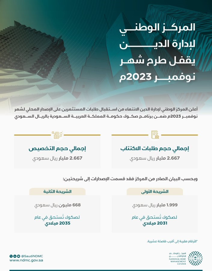 أعلن المركز الوطني لإدارة الدين، اليوم الثلاثاء، الانتهاء من استقبال طلبات المستثمرين على الإصدار المحلي لشهر نوفمبر 2023م ضمن برنامج صكوك حكومة المملكة العربية السعودية بالريال السعودي.