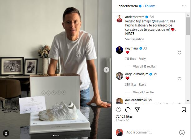 ومن جانبه شارك أندير هيريرا زميل نيمار السابق في باريس سان جيرمان ولاعب أتلتيك بيلباو الحالي، لحظات حصوله على هذه الهدية برسالة عبر حسابه على موقع “إنستجرام” جاء فيها:”أفضل هدية يا صديقي، لقد صنعت التاريخ وأشكرك من أعماق قلبي لأنك تتذكرني”.