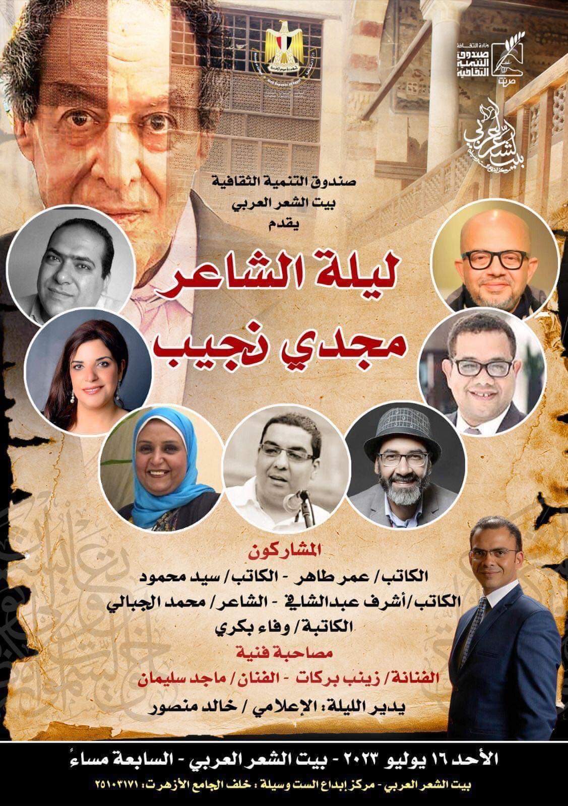 اليوم الأحد 16 يوليو فى تمام الثامنة مساء ينظم بيت الشعر العربي بالقاهرة أمسية شعرية للاحتفاء بالتجربة الإبداعية للشاعر الغنائي الكبير مجدي نجيب .