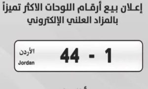 تجاوز سعر بيع رقم مميز للوحة مركبة في الأردن، مليون دولار، بعد انتهاء المزاد العلني الذي طرحته إدارة ترخيص السائقين والمركبات الأردنية على الرقم المميز “1-44“.