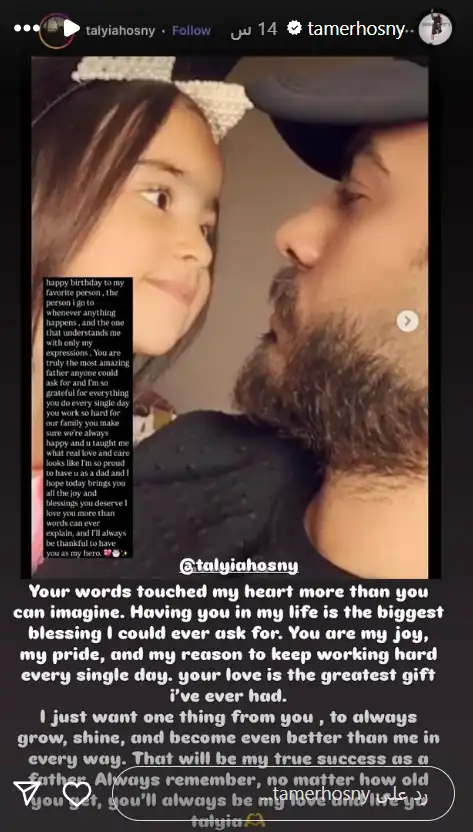 من جانبه، النجم تامر حسني رد على تهنئة ابنته تاليا من خلال “ستوري” عبر حسابه على “إنستغرام”، وقال: لمست كلماتك قلبي أكثر مما تتخيلي. وجودك في حياتي هو أكبر بركة يمكن أن أطلبها. أنت فرحي وفخري، السبب الذي يدفعني للعمل بجد كل يوم. حبك هو أروع هدية حظيت بها.