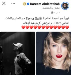 جاء الإعلان عن هذا التعاون عبر صفحته في موقع التواصل الاجتماعي “فيسبوك” وكتب: “قريبا مع النجمة العالمية Taylor Swift من ألحان وكلمات العالمي JHart، وتوزيعي كريم عبدالوهاب”.