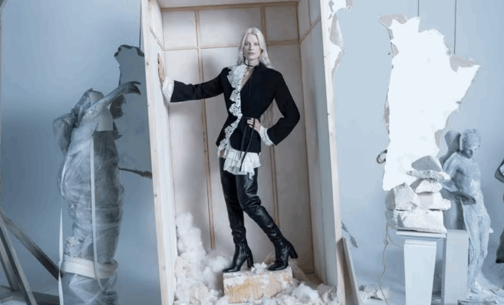 وفي الصور، تظهر عارضة الأزياء كريستين ماكمينامي أيضًا مع عارضات أزياء ملفوفة بقطع قماش بيضاء ولفائف بلاستيكية، وفق ما نقل موقع The National News.