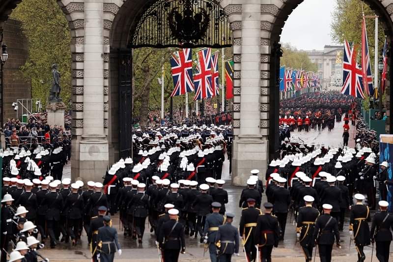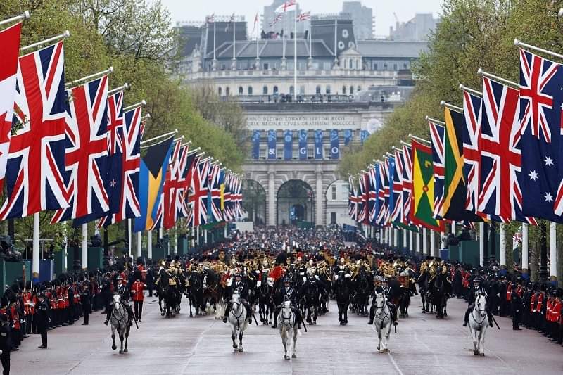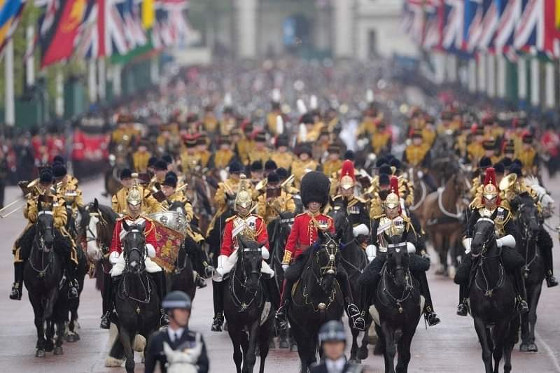 وكان تشارلز وكاميلا غادرا قصر باكنغهام بالعربة “دايموند جوبيلي ستيت كوتش” وتجرها ستة خيول، في موكب تتقدمه فرقتا الخيالة والفرسان ويشارك فيه مئات الجنود. واصطف عشرات الآلاف من الأشخاص على جانبي طريق الموكب وهم يهتفون للملك والملكة، على الرغم من هطول الأمطار المتقطع.