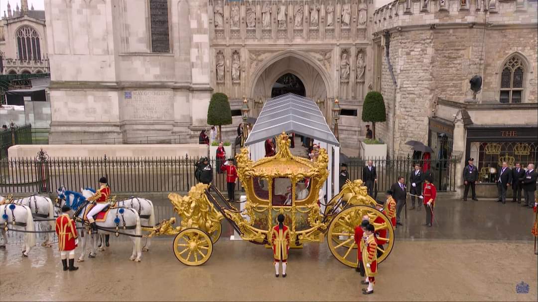 وبعد موكب رافق العربة التي أقلتهما تحت المطر من قصر باكنغهام، عبر تشارلز الثالث وزوجته بلباسهما الملكي، باب الكنيسة لتبدأ مراسم أنغليكانية لتتويجهما من قبل كبير أساقفة كانتربري جاستن ويلبي.
