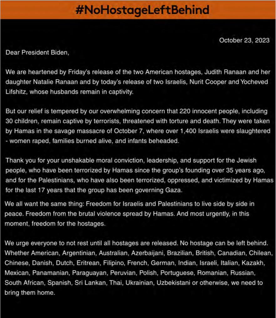 وختمت الرسالة: “نحن جميعنا نريد الشيء نفسه ألا وهو الحرية للإسرائيليين والفلسطينيين لكي يتمكنوا من العيش جنباً إلى جنب بسلام. نريد أن يتحرروا من العنف الوحشي الذي تنشره حماس. والأهم والأكثر إلحاحاً حالياً هو ضمان حرية الأسرى. نحث الجميع على ألا يتوقفوا إلى حين إطلاق سراح جميع الرهائن. لا يمكن أن نترك وراءنا أي رهينة”.