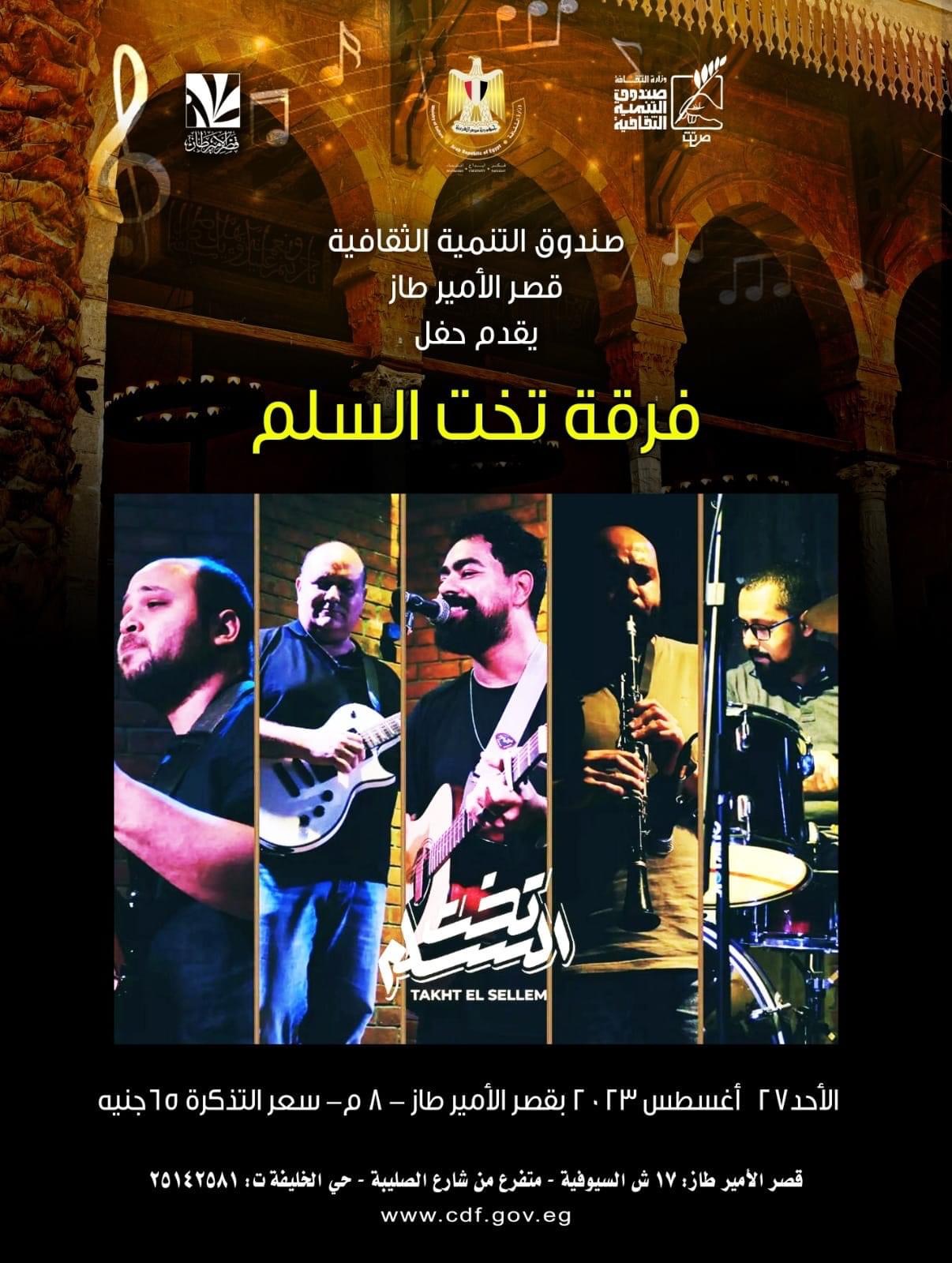 يقيم قصر الأمير طاز التابع لقطاع صندوق التنمية الثقافية فى الثامنة من مساء غدٍ الأحد 27 أغسطس الجارى حفلًا غنائيًا لفرقة “تخت السلم”