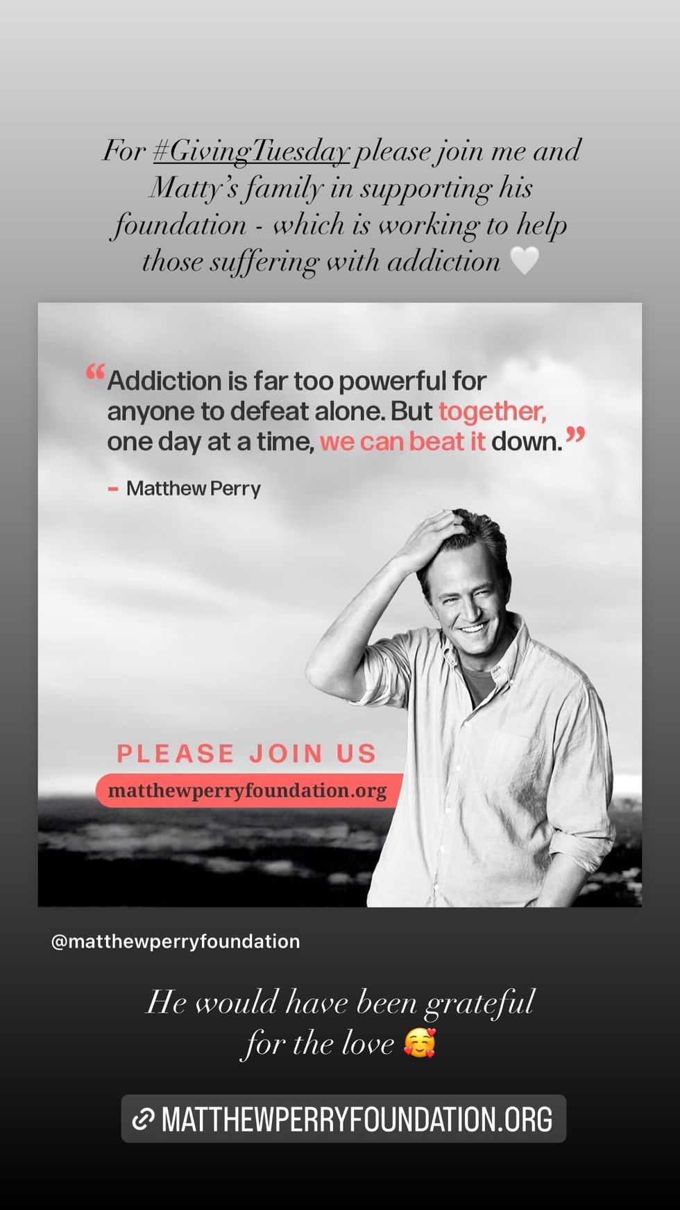 كما شاركت أنيستون منشوراً من الحساب الرسمي لمؤسسة ماثيو بيري، تضمّن اقتباساً من النجم الراحل جاء فيه: “الإدمان أقوى بكثير من أن يتمكن أي شخص من هزيمته بمفرده. ولكن معاً، يوماً بعد يوم، يمكننا التغلّب عليه”.