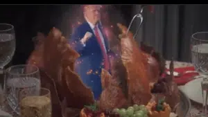 ويظهر الفيديو الرئيس الأميركي، جو بايدن، مع زعماء الحزب الديمقراطي يحتفلون ويظهر لهم فجأة ترامب في طائر الحبش، والذي يعتبر من أولويات المائدة في هذا العيد.