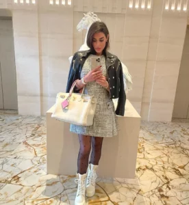 اعتمدت ياسمين صبري في إطلالتها على فستان يمزج بين اللونين الأبيض والأسود بتصميم الفساتين القصيرة المنفوشة ونسقته مع هاف بوت أبيض وحقيبة يد من نفس اللون، كما وضعت جاكت شتوي أسود جلد على كتفيها.
