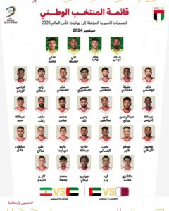 استدعى المدير الفني البرتغالي لمنتخب الإمارات باولو بينتو،26 لاعباً بينهم 4 لاعبين مجنسين جدد لخوض مباراتي قطر وإيران على التوالي في الدور الثالث من التصفيات الآسيوية المؤهلة لكأس العالم 2026.