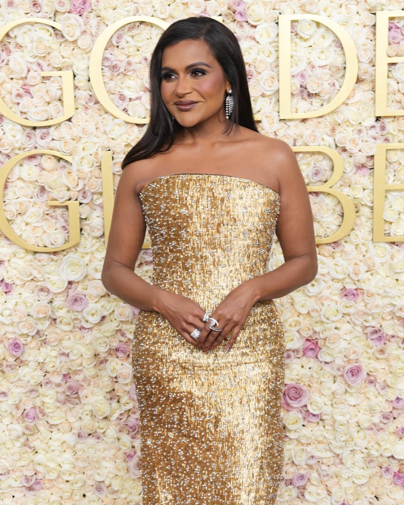 اما ماندي كايلينغ الممثلة والمنتجة أمريكية، اختارت ثوباً ذهبياً شديد المعان بسيط القصة وافر الظهور بلمعانه الفضي الموشى بالكامل ظهور خلاب بقصته المنسدل بخط رقيق على الجسم.