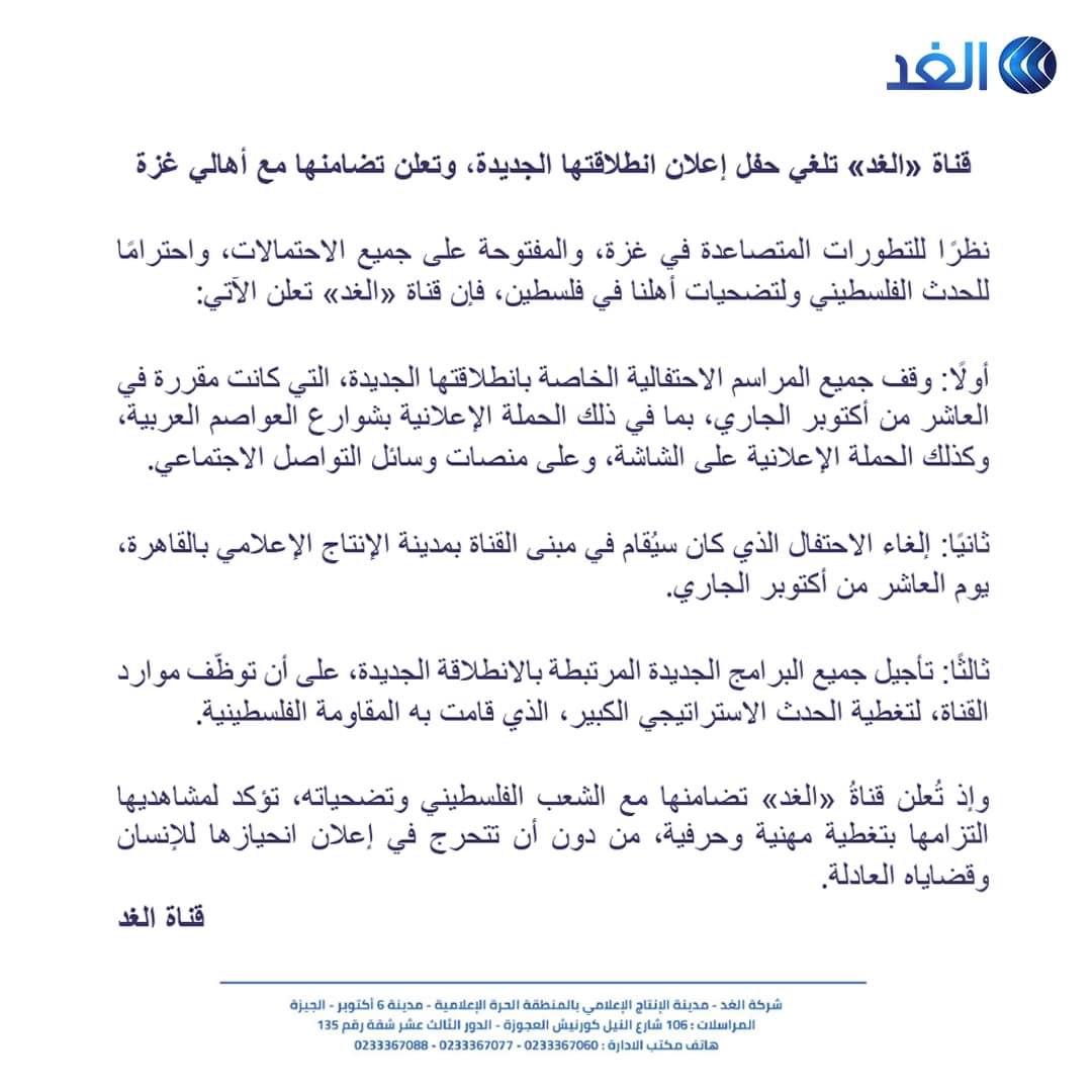 على خلفية التطورات المتصاعدة في غزة، واحتراماً للحدث الفلسطيني وتضحيات أهل فلسطين، أعلنت قناة “الغد” وقف جميع المراسم الاحتفالية الخاصة بانطلاقتها الجديدة، التي كانت مقررة في العاشر من الشهر الجاري، بما في ذلك الحملة الإعلانية بشوارع العواصم العربية وتلك الإعلانية على الشاشة، وعلى منصات وسائل التواصل الاجتماعي.