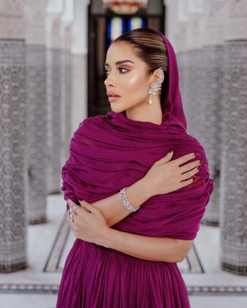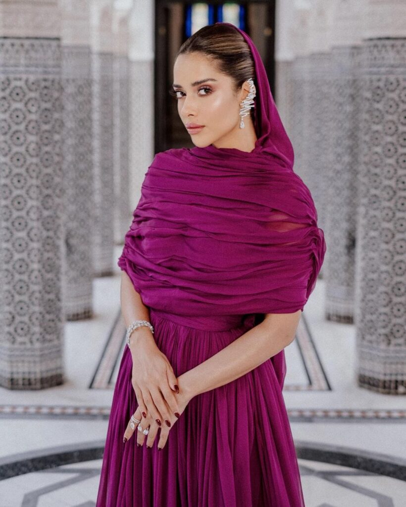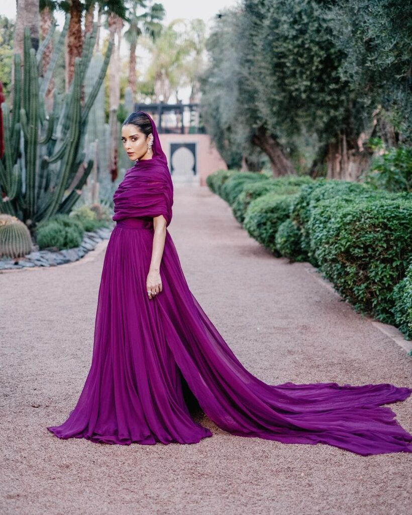 هذه الإطلالة جاءت خلال حضورها حفل فاشن تراست أرابيا في مراكش من تصميم Giambattista Valli . ثوب الخفر الأرجواني تقطن فيه معاني فهذا اللون الذي عرف بلون السلاطين والملوك وهذه القصة المتحفظة فيها الكثير من الغموض الأنيق والتعالي برفوله الطويل على الارض وكثافة قماشه ورقة انسداله.