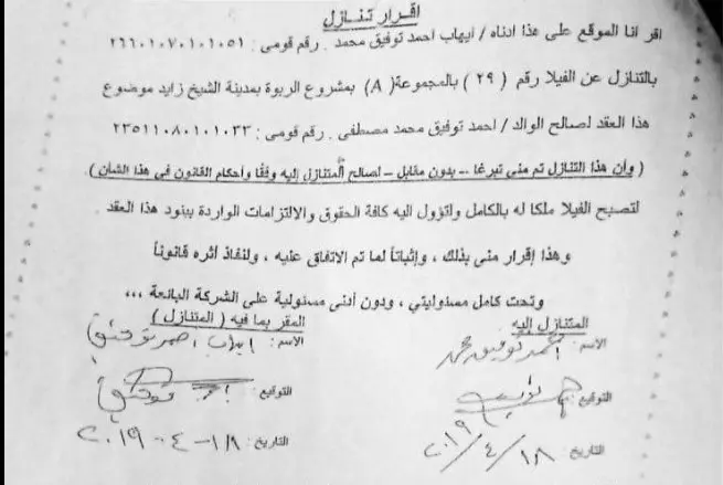 وأكد رجل الأعمال أن لديه مستندا رابعا يفيد بأن توفيق خسر قضية الاستئناف الثانية، وعوقب بغرامة، مطالبا الفنان بسحب تنازله عن الفيلا لوالده أو تسليمه عقد شراء له باسمه من جديد.