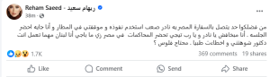 وكتبت سعيد: “من فضلكم، ليتصل أحد بالسفارة المصرية، نادر صعب استخدم نفوذه وتسبب بتوقيفي في المطار تزامناً مع وصولي لأحضر الجلسة”.