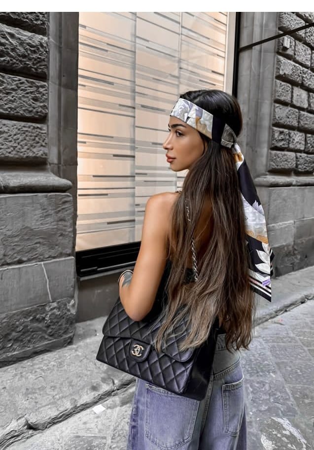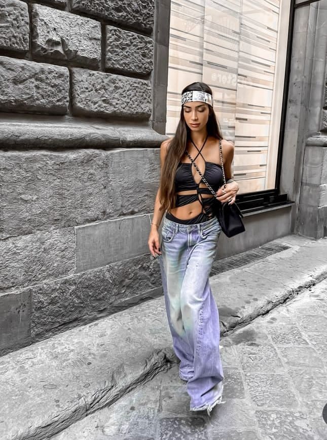 استعرضت تيا تصميمها شخصياً وارتدت المايو كأنه قطعة لباس فوقية مع جينز بخصر منخفض واسع وحملت حقيبة شانيل سوداء مع ربطة شعر “بندانا” كدلالة على فخامة الرداء والقطعة التي صممتها.