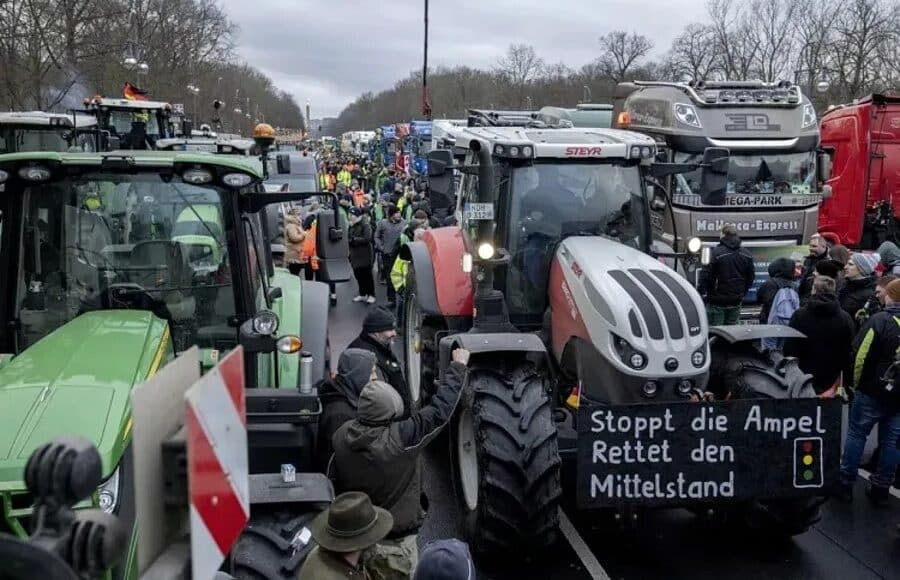 كما يتزايد الغضب في ألمانيا بسبب خطط الإلغاء التدريجي لدعم الوقود الذي تصل قيمته إلى 3000 يورو سنويًا للشركات المتوسطة. ولم يصل الاستياء طويل الأمد إزاء التطبيق غير العادل للسياسات البيئية إلا إلى صب الوقود على النار. ويخرج المزارعون إلى الشوارع منذ ديسمبر. وامتلئت الشوارع بالمركبات الثقيلة.
