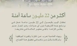 وشملت ساعات العمل الآمنة، 5.5 مليون ساعة عمل في مشروع ميدان الثقافة، و5.5 مليون ساعة عمل في ترميم المباني التاريخية، إلى جانب 5 ملايين ساعة عمل في مجال الأمن والسلامة، و3 ملايين ساعة عمل في مجال الصيانة والنظافة، وكذلك 1.5 ساعة في أعمال بحيرة الأربعين، و1.5 مليون ساعة عمل في تنظيم المبادرات والأنشطة الثقافية.